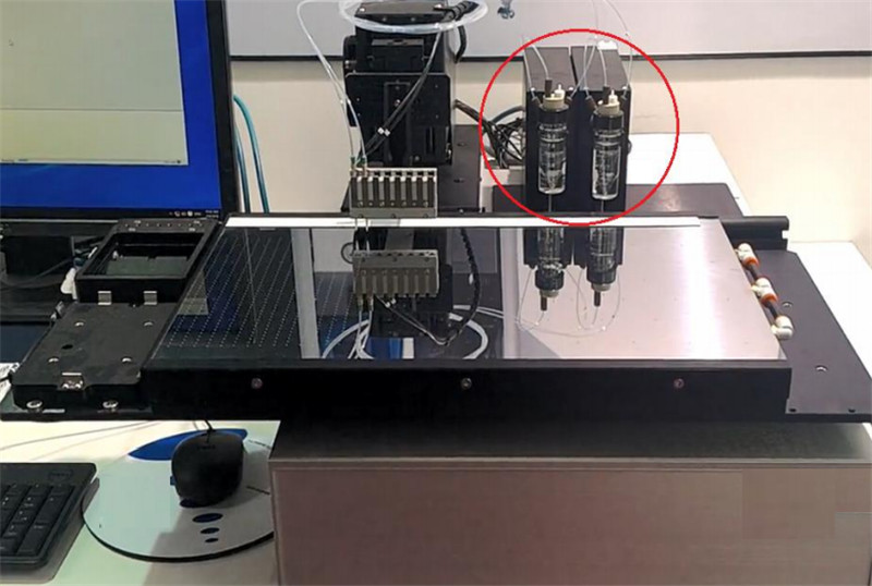 (1)平臺可根據(jù)需要配置多種噴頭,適合用于金標(biāo)試劑、封閉液、預(yù)處理液等的分散定量噴點(diǎn),噴頭由高精度步進(jìn)泵供給溶液。